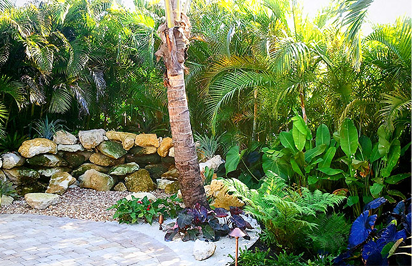 A tropical garden style South Florida yard is also refreshed with the sound of falling water. Using a natural rock water feature which recirculates through an underground gravel reservoir, this type of water feature leaves no pool of open water exposed to attract insects or be a danger to small children.